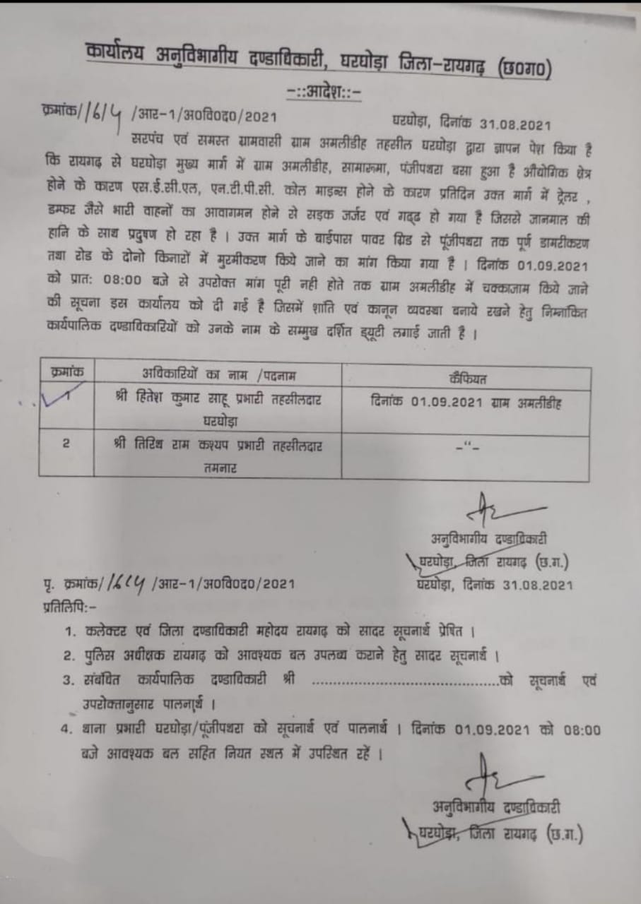 घरघोड़ा मार्ग के नेशनल हाइवे सड़क मार्ग की जर्जर स्थिति और धूल – प्रदूषण को लेकर आज 1 सितंबर घरघोड़ा क्षेत्र के ग्रामीणों का गुस्सा फूट पड़ा और उन्होंने उग्र आंदोलन कर अमलीडीह में सुबह 7 बजे से चक्का जाम कर प्रशासन के खिलाफ जमकर नारेबाज़ी की और कहा कि अगर उनकी मांगें पूरी नहीं कि गई तो वे आगे उग्र आंदोलन के लिए बाध्य होंगे।