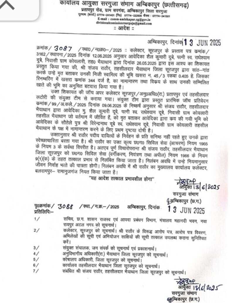 तहसीलदार निलंबित , …. मृत दिखाकर किया था भूमि का नामांतरण