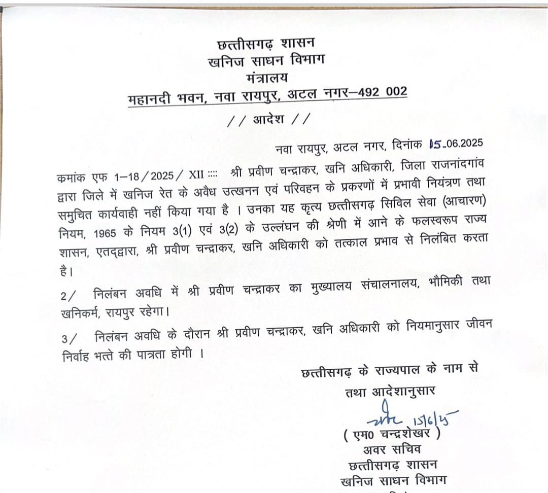 रेत चोरी को लेकर बड़ी कार्यवाही , खनिज अधिकारी को किया निलंबित