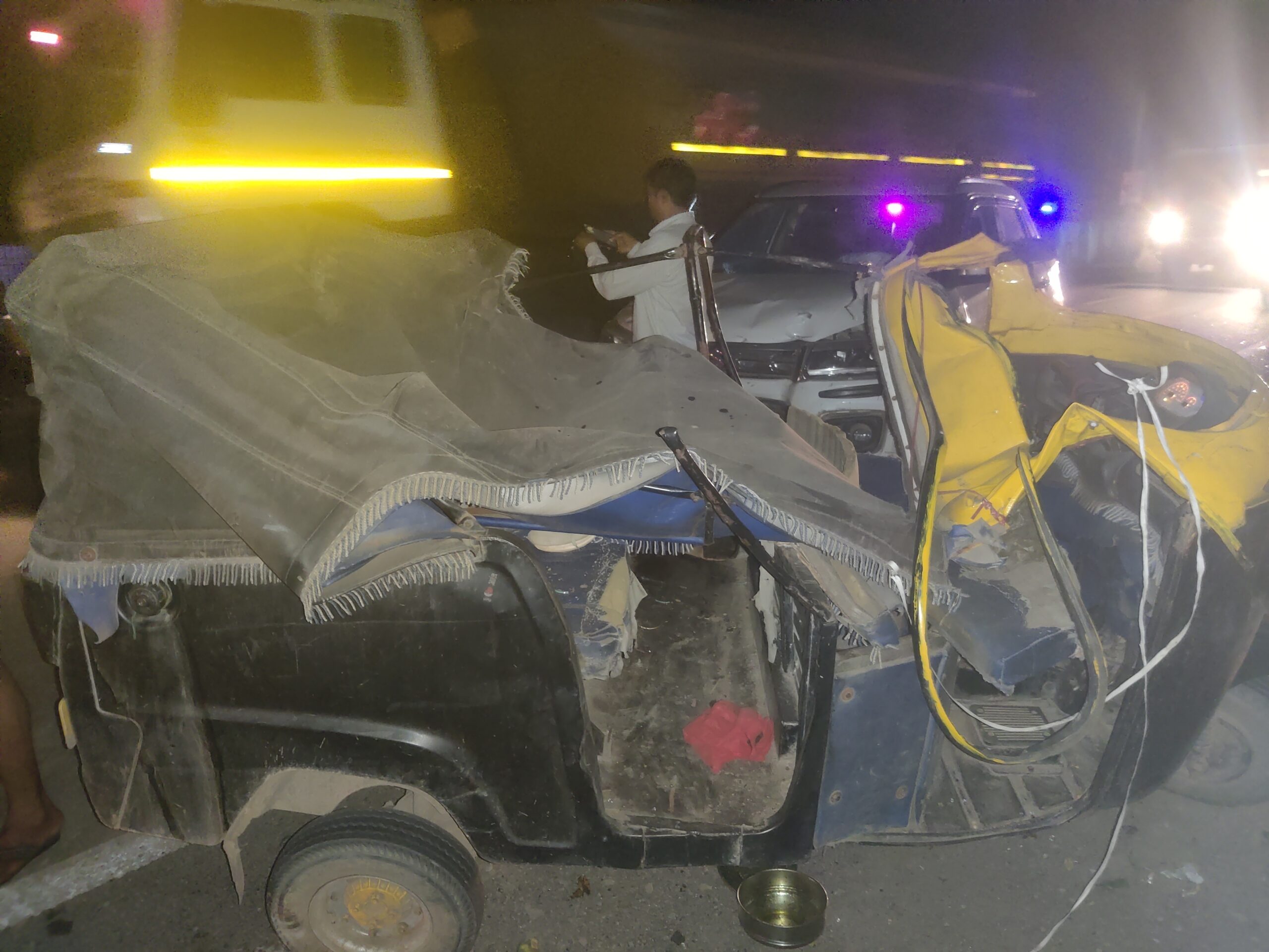 ऑटो और ब्रेजा कि भिड़ंत में ऑटो के उड़े परखच्चे