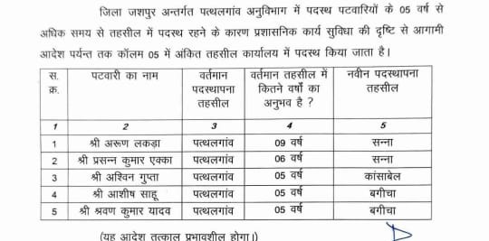 डेस्क खबर खुलेआम जशपुर — जिले के कलेक्टर द्वारा जनवरी माह में पत्थलगांव तहसील कार्यालय में पाँच वर्ष से अधिक समय से पदस्थ पाँच ...