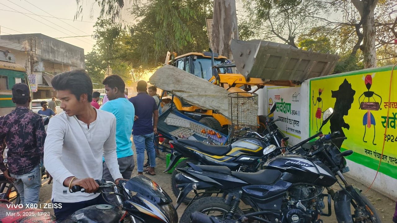 जेसीबी चालक की लापरवाही से फल विक्रेता घायल , तोड़ा पंचायत का बाउंड्री