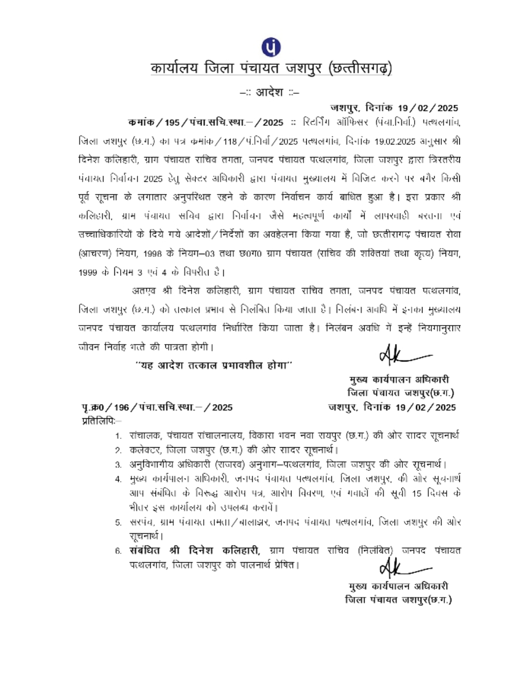 चुनाव कार्य से गायब सचिव हुआ निलंबित