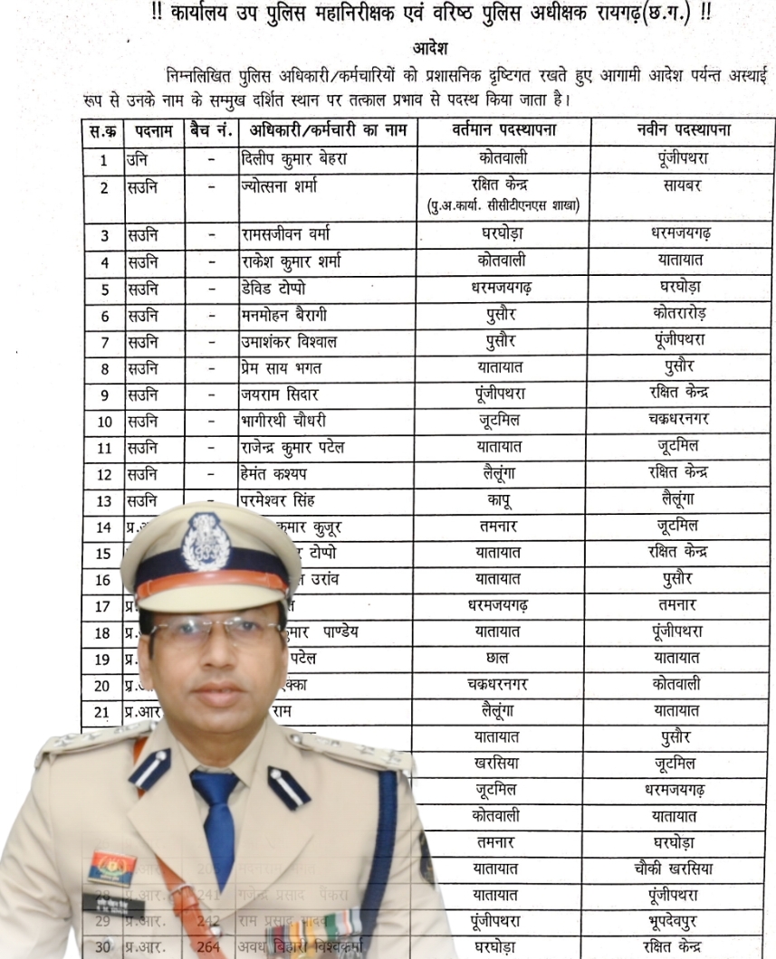 खबर खुलेआम रायगढ़। रायगढ़ एसएसपी शशि मोहन सिंह ने जिले में कानून व्यवस्था को और अधिक मजबूत बनाने के उद्देश्य से पुलिस विभाग में ...