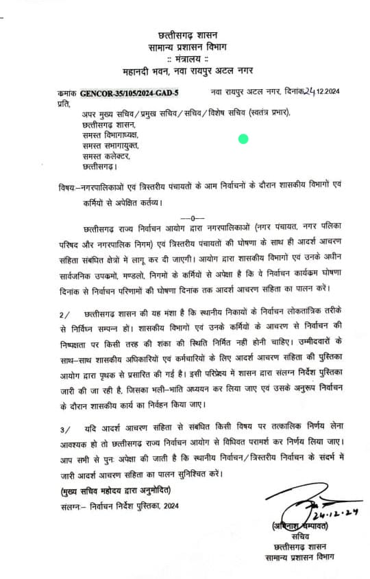 नगरीय एवं ग्राम पँचायत चुनाव को लेकर आचार संहिता संबंधी पत्र जारी