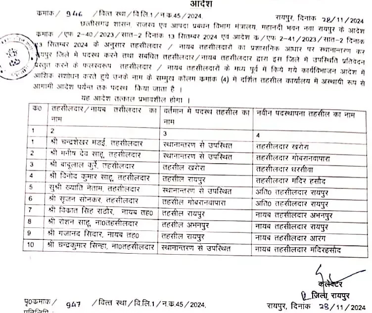 तहसीलदार और नायब तहसीलदारों का ट्रांसफर, आदेश जारी
