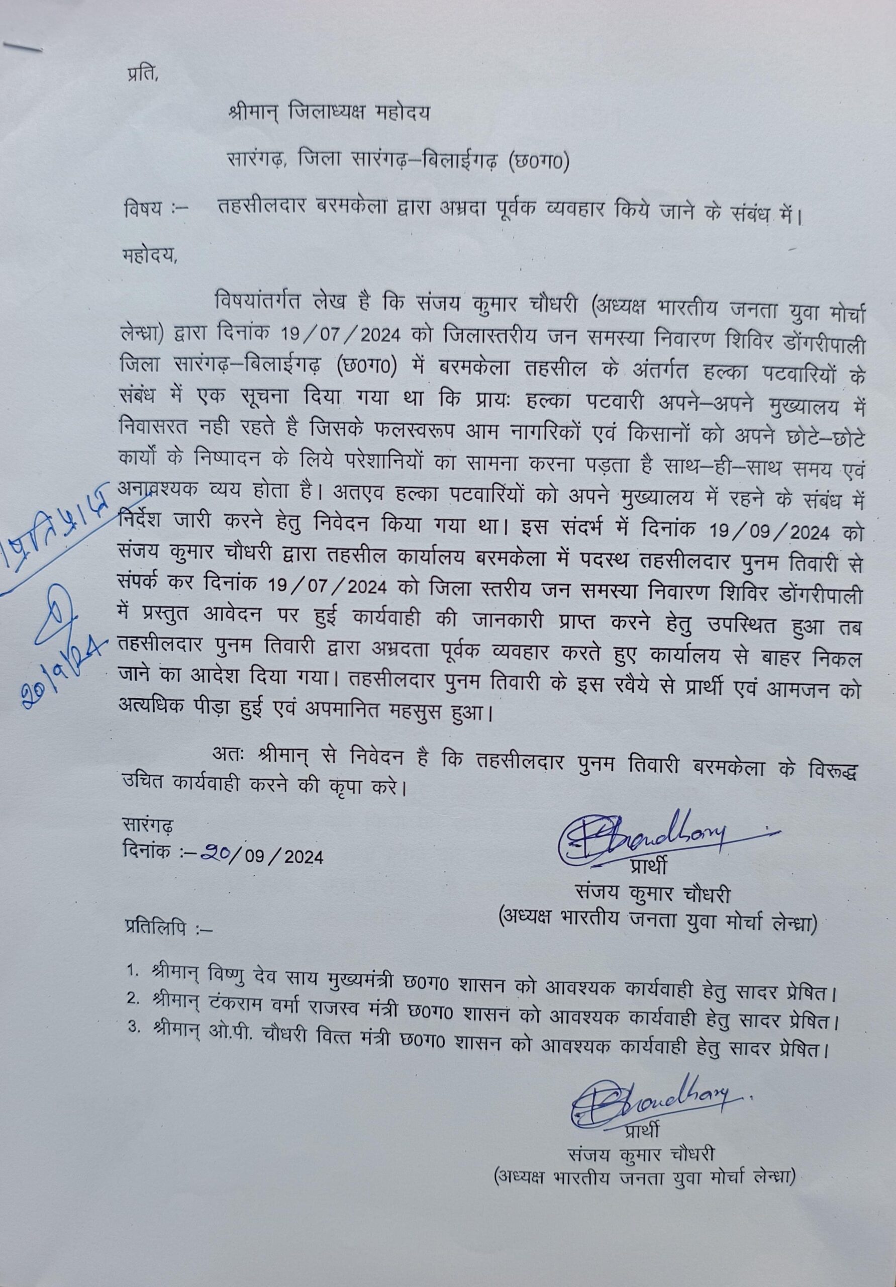 मुख्यमंत्री के आदेश ….. अब इस युवा मोर्चा नेता से तहसीलदार ने किया दुर्व्यवहार …. मामला मुख्यमंत्री से कलेक्टर तक पंहुचा