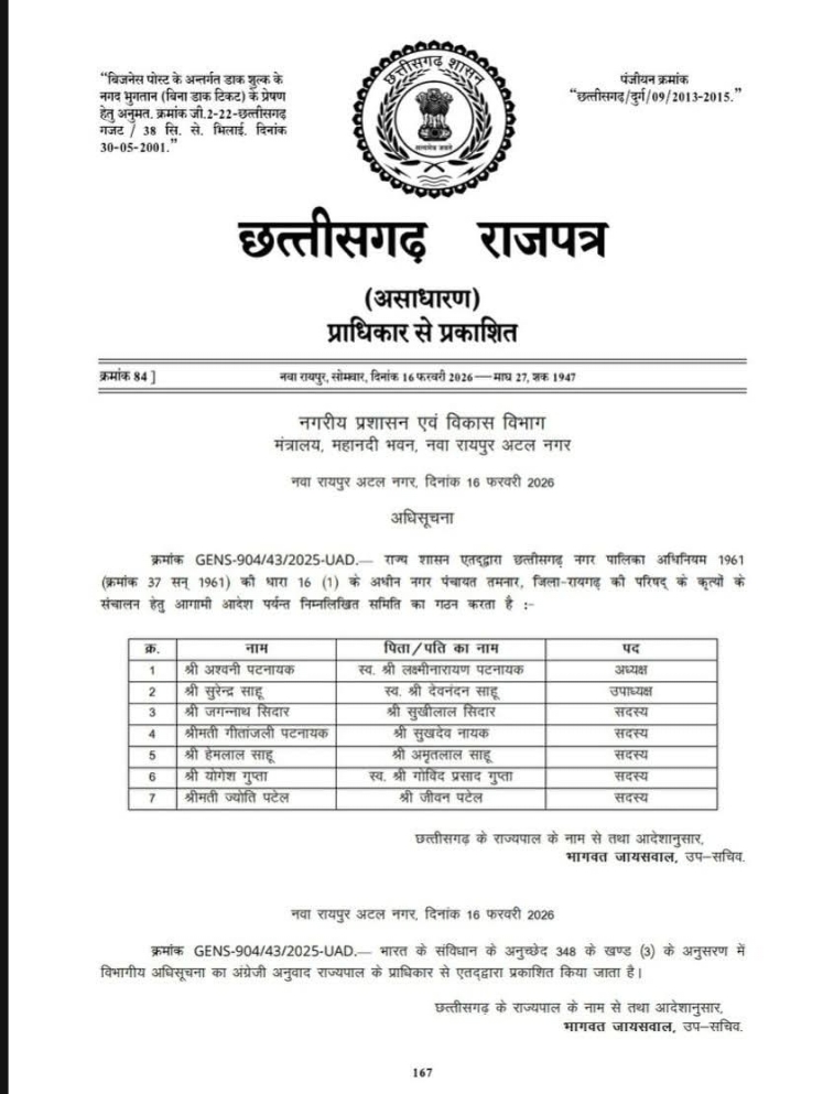 डेस्क खबर खुलेआम नवा रायपुर, 16 फरवरी 2026: छत्तीसगढ़ शासन के नगरीय प्रशासन एवं विकास विभाग द्वारा आज एक महत्वपूर्ण अधिसूचना जारी की गई ...