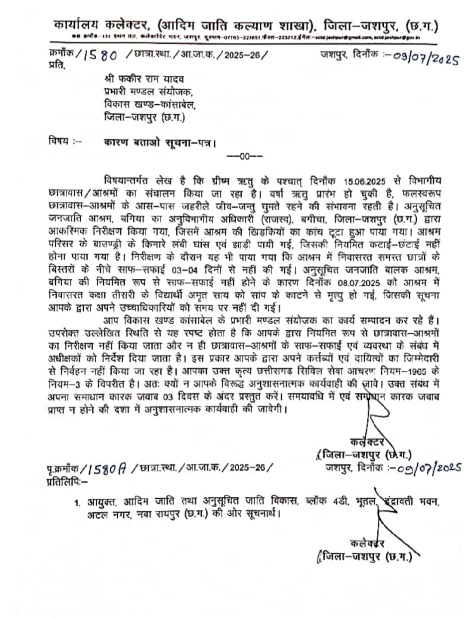 हॉस्टल में छात्र कि मौत …. कलेक्टर ने मंडल संयोजक को थमाया कारण बताओ नोटिस