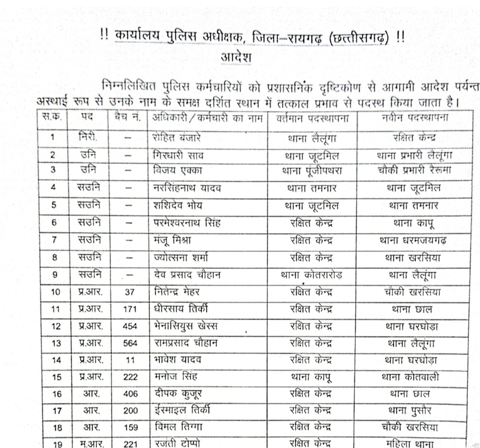 खबर खुलेआम रायगढ़ एसपी दिब्यांग पटेल ने प्रशासनिक कसावट लाने के उद्देश्य से जिला में बड़े पैमाने में फेरबदल किया है सूची में निरीक्षक ...